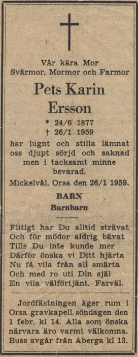 Karin Ersson (f.Jonsdotter) fick efter Pets Eriks död namnet Pets Karin.