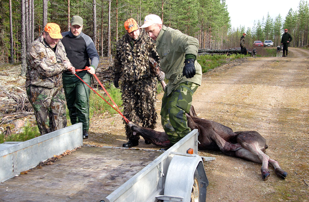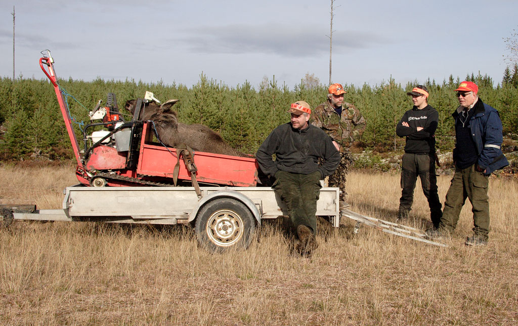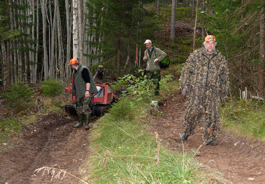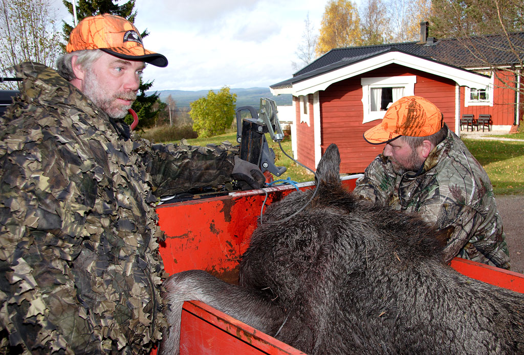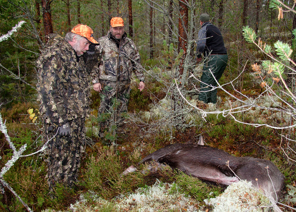 ![]() Micke Thoms, Mats Jakobsson och Tord Nilsson med Rolles älgkalv Tjärdalen hemskog |