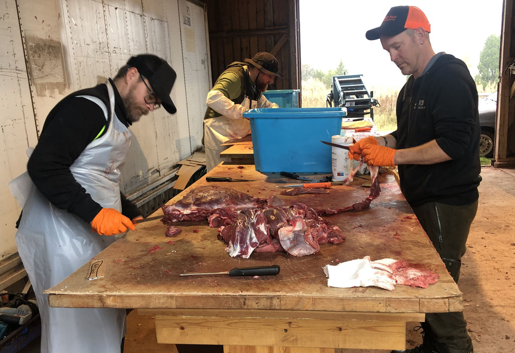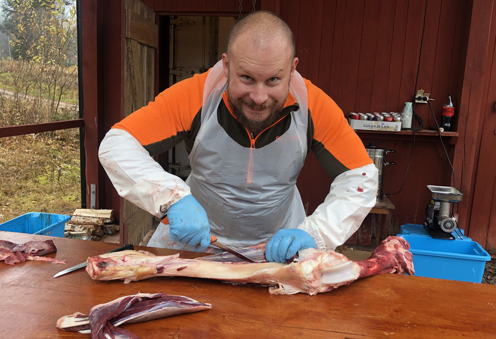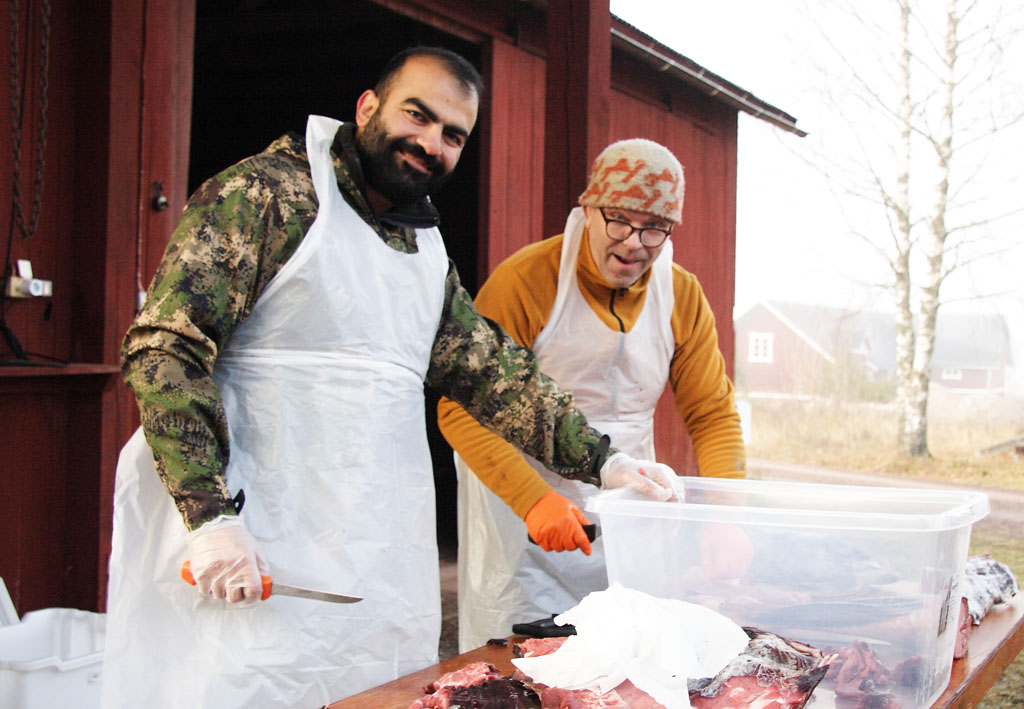 ![]() Reber Hamki och Tomas Johansson styckar älgkalven från efterjakten 2024 |